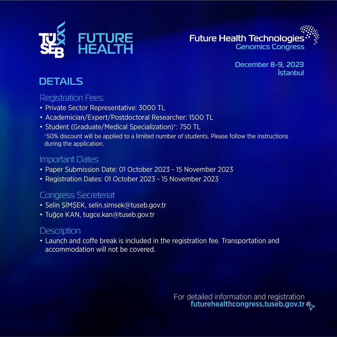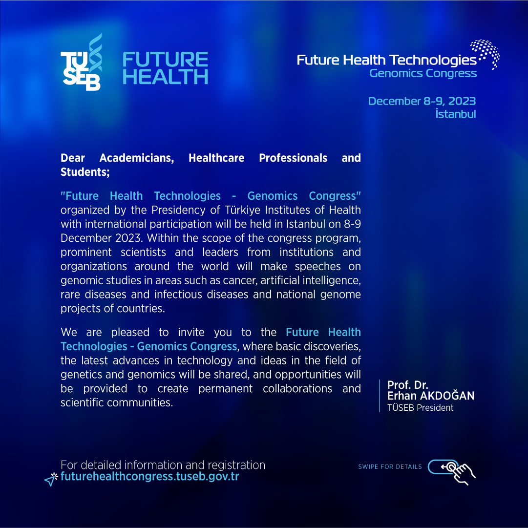 "Future Health Technologies-Genomics Congress" organized by the Presidency of the Institutes of Health of Türkiye will be held in Istanbul on 8-9 December 2023. Within the scope of the congress, Türkiye National Genome and Bioinformatics Project will be launched, prominent scientists and leaders from institutions and organizations around the world will make presentations on genomic studies in areas such as cancer, artificial intelligence, rare diseases and infectious diseases. Representatives of important national genome projects around the world will also share their experiences in their countries.