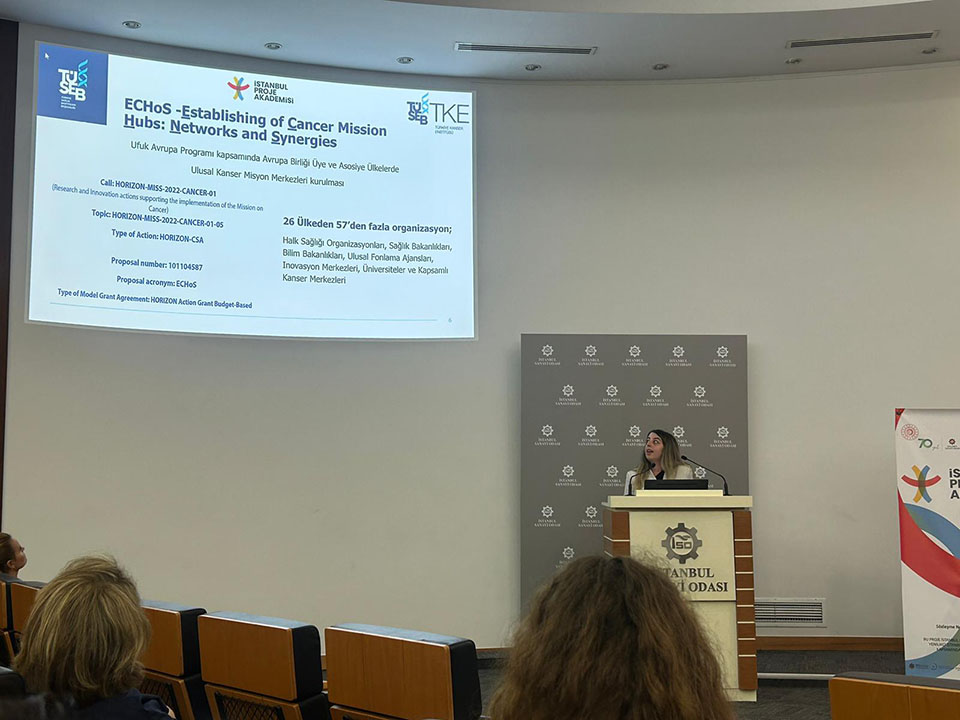 T.C. Sanayi ve Teknoloji Bakanlığı, İstanbul Kalkınma Ajansı, İstanbul Sanayi Odası ve İstanbul Proje Akademisi tarafından 5 Eylül 2023 tarihinde Ufuk Avrupa Sağlık Kümesi 2024 yılı çağrılarına yönelik düzenlenen “Ufuk Avrupa Küme 1: Sağlık Ulusal Proje Pazarı” etkinliği gerçekleştirilmiştir. Etkinliğe Türkiye Kanser Enstitüsünden İrem Nur ATEŞ katılım sağlamıştır. “Ufuk Avrupa Projesi; ECHOS” başlıklı sunum ile TÜSEB’ in kanser alanında benimsemiş olduğu misyondan ve bu doğrultuda yapılan projelerden bahsedilerek bilimsel iş birlikleri açısından TÜSEB’in sağlayabileceği desteklerden bahsedilmiştir.