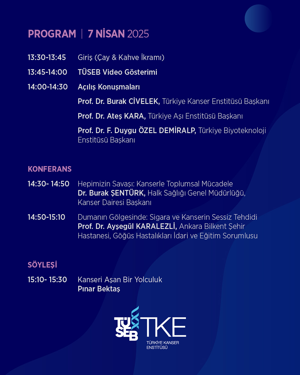 Türkiye Kanser Enstitüsü Ulusal Kanser Haftası kapsamında 7 Nisan 2025 tarihinde TÜSEB Aziz Sancar Araştırma Merkezinde Ulusal Kanser Haftası Etkinliği düzenleyecektir.